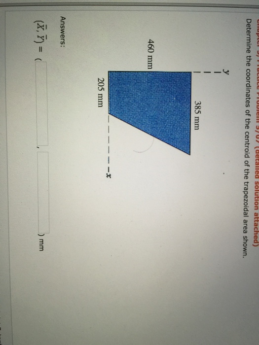 (x,y)= (i save for later 330 mm ) mm attempts: Civil engineering questions and answers. Determine the coordinates of the centroid of the trapezoidal area shown. Assume a = 400 mm, b = 580 mm, c = 685 mm. Determine the coordinates of the centroid of the trapezoidal area shown. Assume a = 400 mm, b = 580 mm, c = 685 mm. Solution for determine the coordinates of the centroid of the trapezoidal area shown. 155 mm 180 mm 280 mm answer: (x, y) = ( i ) mm i skip to main content.
