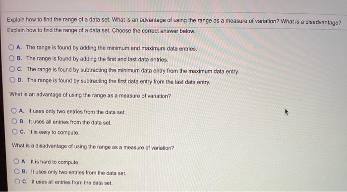 Central tendency is measured by using the mean, median and mode of a set of numbers. Variation is measured by using the range, variance and standard deviation of a. Explain how to find the range of a data set. Choose the correct answer below. The range is found by adding the first and last data entries. The range is found by adding the minimum and maximum data entries. Explain how to find the range of a data set. What is an advantage of using the range as a measure of variation? 1. 3 what does the range represent?
