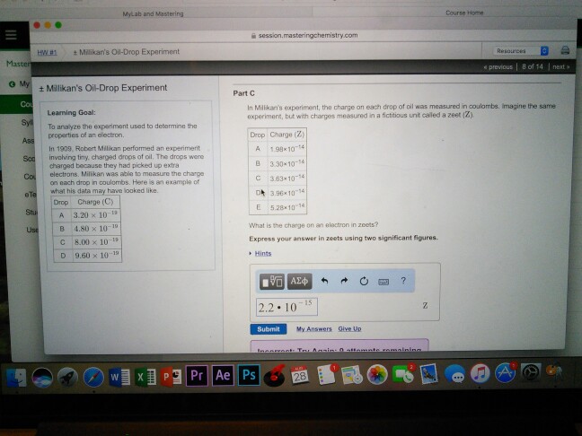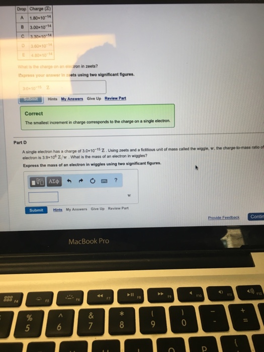 The millikan oil drop experiment measures the ratio of an electrons charge to its’ mass. There are a number. One electron has a charge of 2. 1×10−15 z. What is the charge on an electron in zeets? The charge on an electron? An electron has a charge of. What is the charge on an electron in zeets? Express your answer in. What is the charge on an electron in zeets?