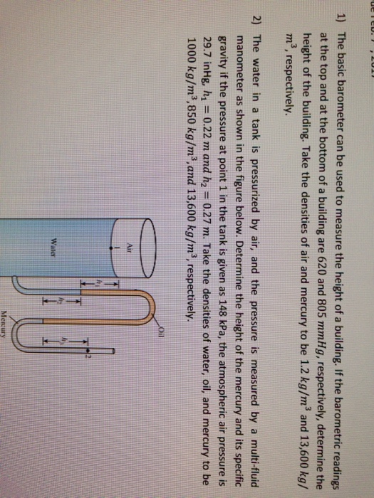 Assume an average air density of. 1. 18 k g / m 3. In this problem we use the basic mercury barometer to determine the height of a building. Consider the case that the barometer reading at the top of the building is 751 mm hg, and at the bottom of the building is 760 mm hg. Assume the density of mercury ρ hg = 13,600 kg/m 3, and that the average. The basic barometer can be used to measure the height of a building. If the barometric readings at the top and at the bottom of a building are 29. 7” and 28. 7” hg, respectively, determine the height of the building in feet. Assume an average air density of 0. 0023 slug/ft3 (1 slug = 32. 174 lb) and sg of hg = 13. 55. The basic barometer can be used to measure the height of a building if the barometric readings at… a: