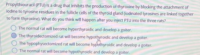 What do you think will happen after you inject thyroxine into the three rats? The normal rat will become hyperthyroidic and develop a goiter. What do you think will happen after you inject tsh into the three. Propylthiouracil (ptu) is a drug that inhibits the production of thyroxine by blocking the attachment of iodine to tyrosine residues in the follicle cells of the thyroid gland (iodinated tyrosines are linked together to form thyroxine). What do you think will happen after you inject ptu into the three rats? The normal rat will become hyperthyroidic and develop a. Propylthiouracil (ptu) is a drug that inhibits the production of thyroxine by blocking the attachment of iodine to tyrosine residues in the follicle cells of the thyroid gland (iodinated tyrosines are linked together to form thyroxine). What do you think will happen after you inject ptu into the three rats? What do you think will happen after you inject ptu into the three rats?